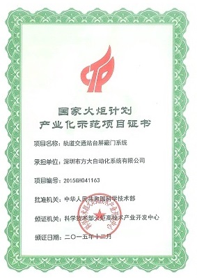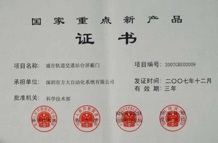 方大站臺屏蔽門(mén)系統產(chǎn)品獲國家重點(diǎn)新產(chǎn)品證書(shū)。