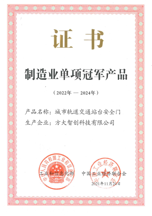 方大智源“城市軌道交通站臺安全門(mén)”榮膺工信部“制造業(yè)單項冠軍產(chǎn)品”認定。